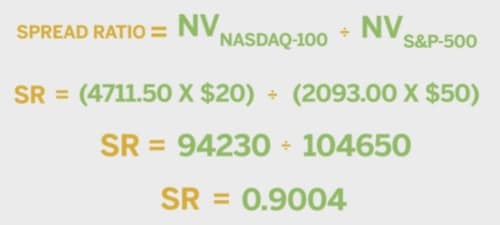 In order to construct this spread, we must first calculate a Spread Ratio. The spread ratio is defined as the notional value of one index future divided by the notional value of another.