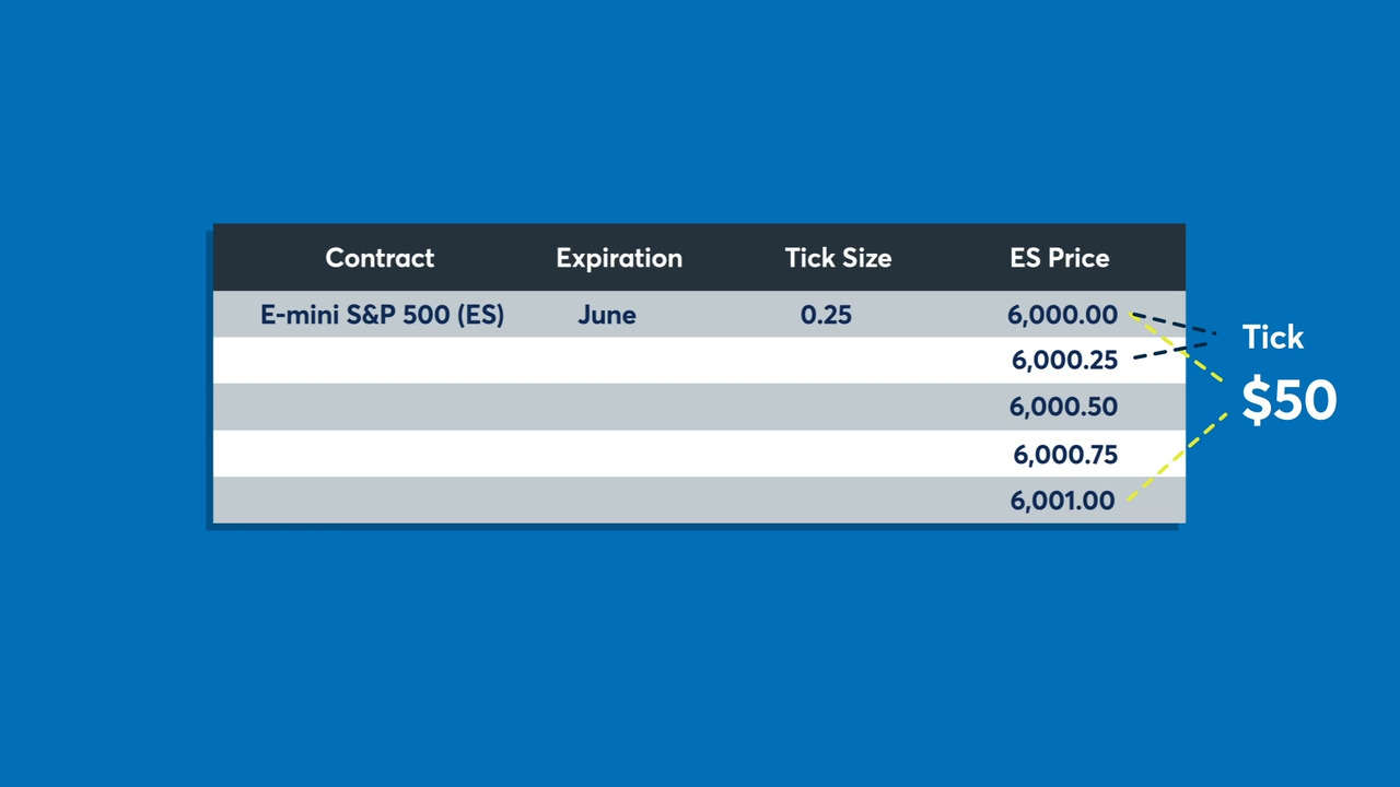For example, the tick size of an E-Mini S&P 500 Futures Contract is equal to one quarter of an index point. Since an index point is valued at $50 for the E-Mini S&P 500, a movement of one tick would be