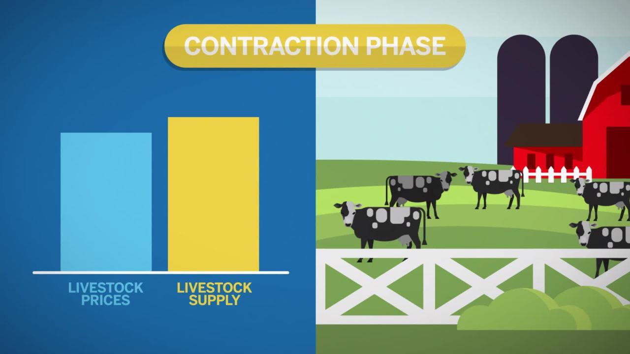 In the expansion phase of a cycle, an increase in livestock prices may encourage producers to retain female animals to increase the herd, which can reduce supply and cause further price increases. Then, production of offspring by these females may result in an oversupply, causing prices to decline and triggering producers to cull their herd and send them to market, starting the contraction phase of the cycle.