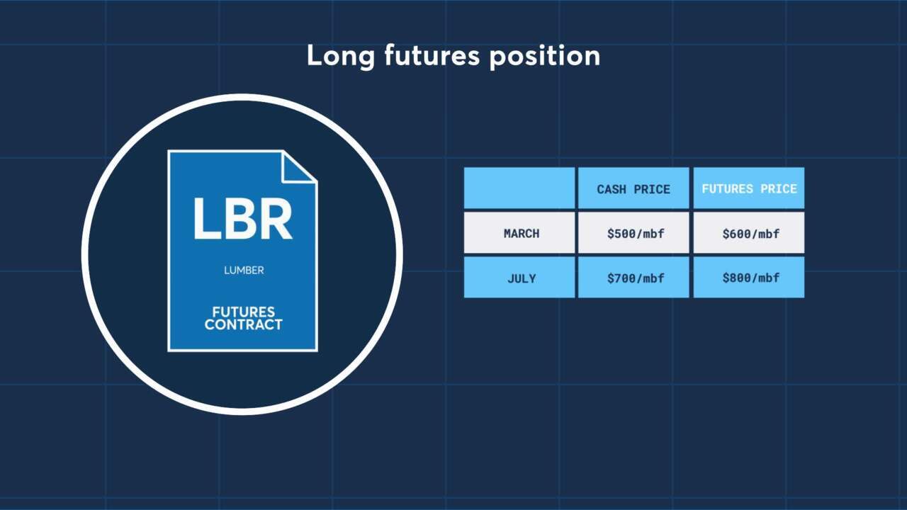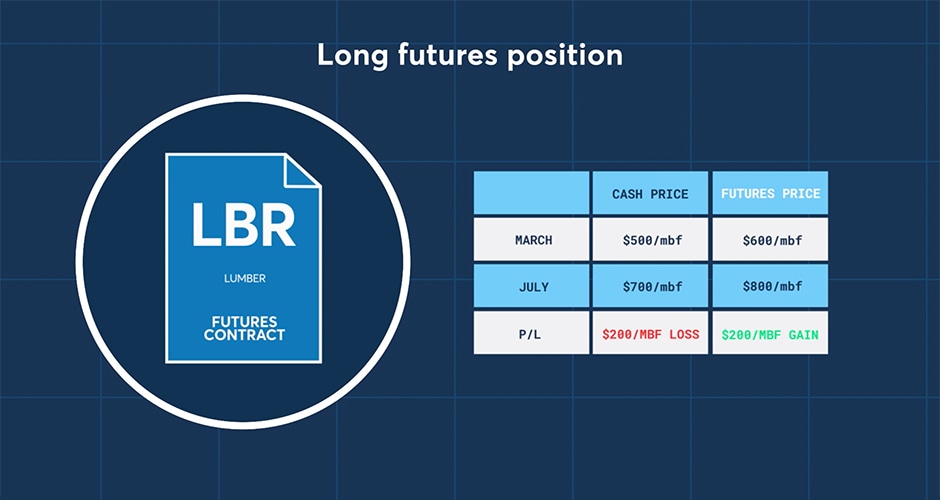 To hedge their summer lumber purchase, the construction company will buy, or go long, 20 July Lumber futures contracts. Fast forward to July, and we see prices have increased. The cash price of lumber has moved to $700/mbf. Since cash prices and futures prices are highly correlated, we see the futures contract price has also increased to $800/mbf.