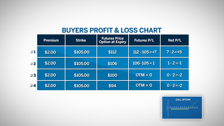 In this case you buy a call at $105, and pay a $2 premium to the seller. We will look at your profit and loss potential using the same futures prices at option expiration.