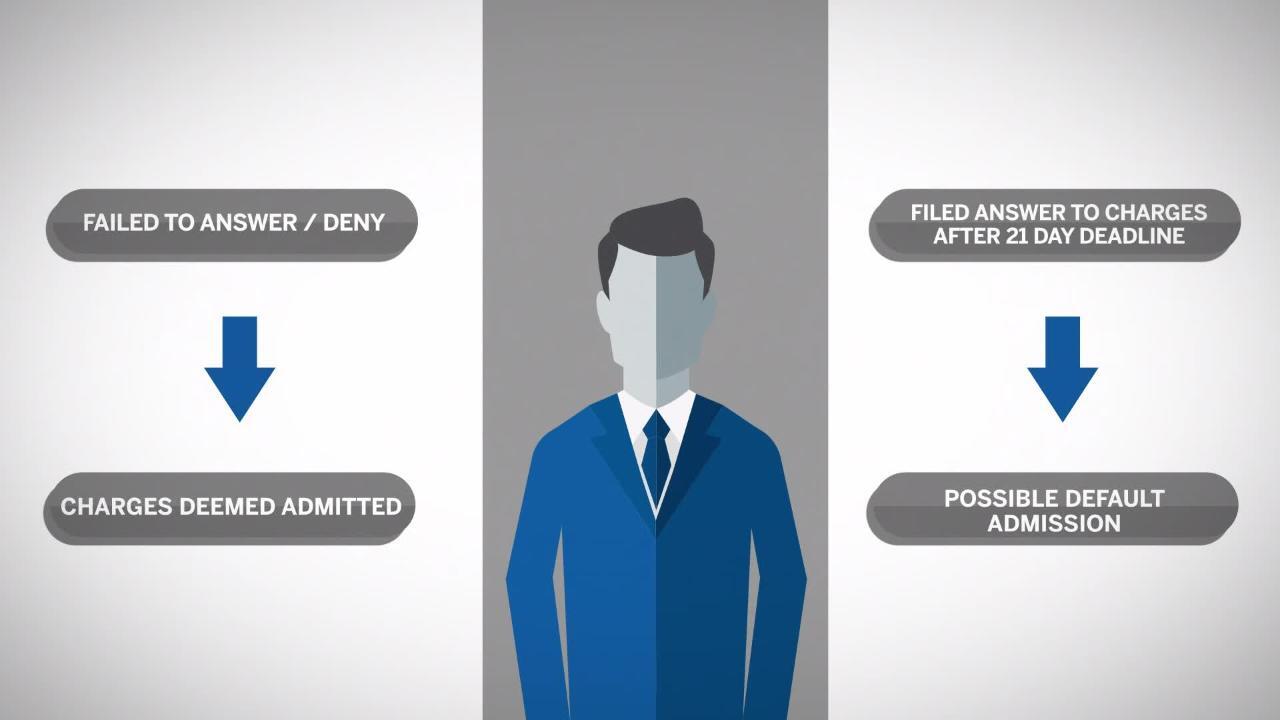 If the respondent fails to answer the charges, or answers but fails to deny the charges, or answers but not within 21 days, Market Regulation will file a written motion with the BCC Hearing Panel Chair asking for an order finding the respondent to be deemed to have admitted the charges issued by default. The respondent may file a response to the motion by contacting counsel to the Panel.