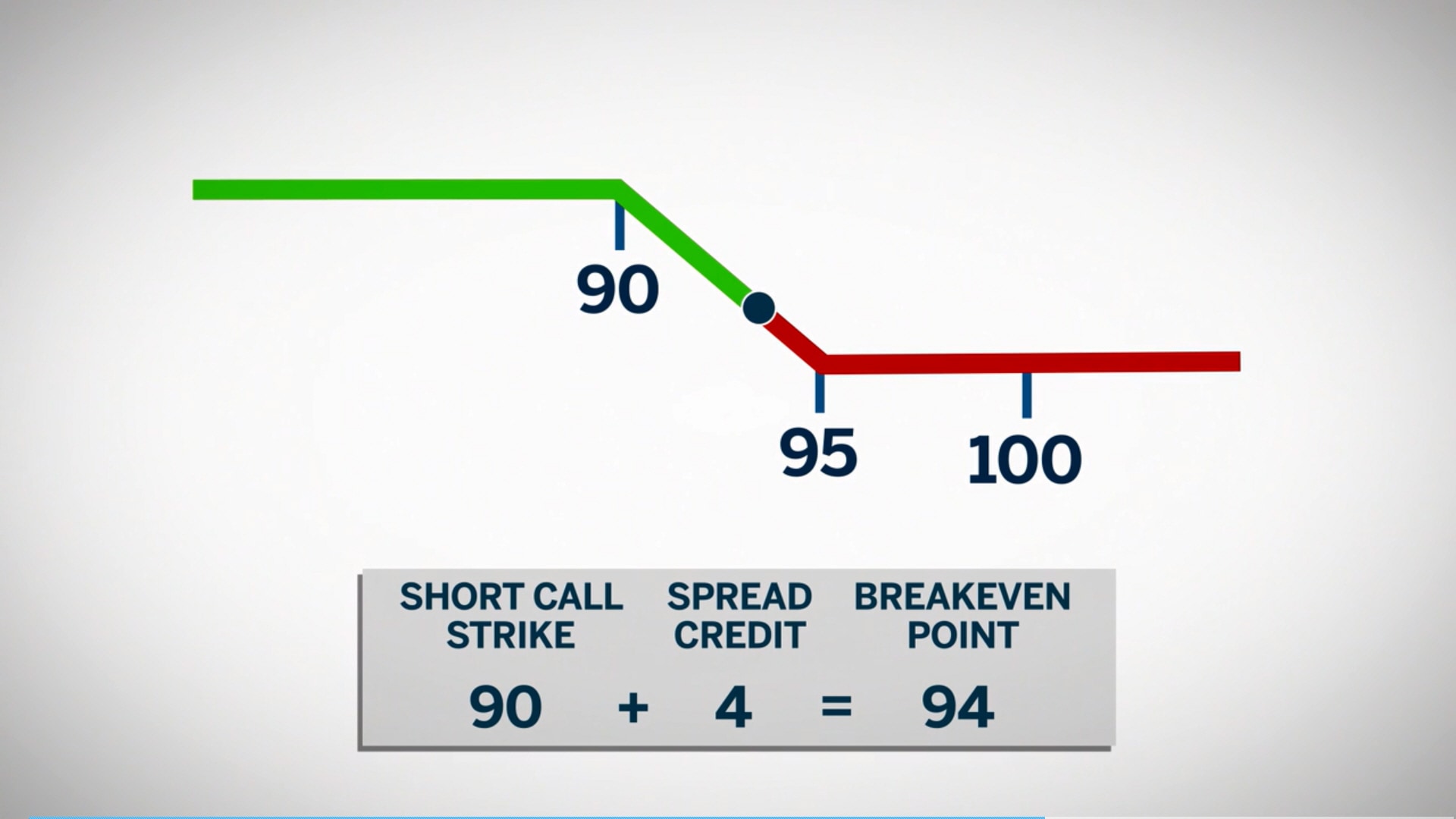 The breakeven point for this spread is 94: the 90 strike plus the spread credit of $4. This is the same breakeven point as the put bear spread.