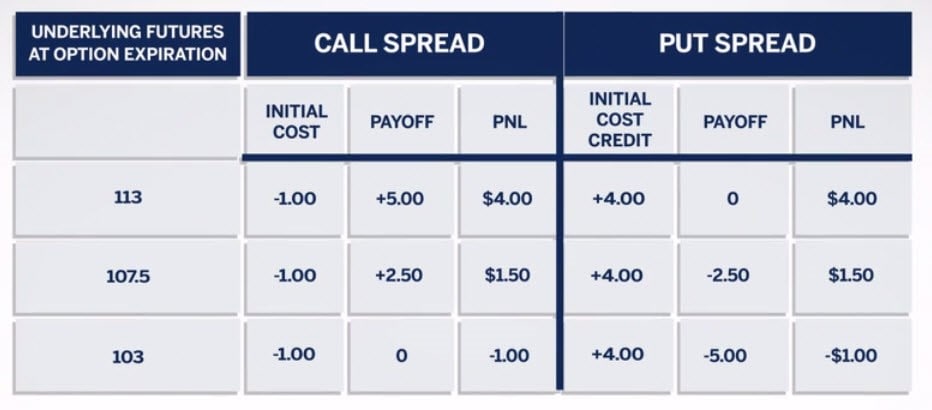 Instead of buying the 105-110 call spread, we can sell the 110-105 put spread. This would entail selling the 110 puts and buying the 105 puts which would result in a $4 credit with the underlying future trading at 100