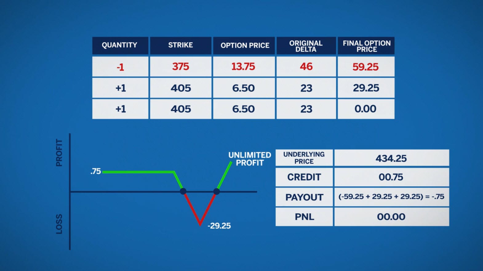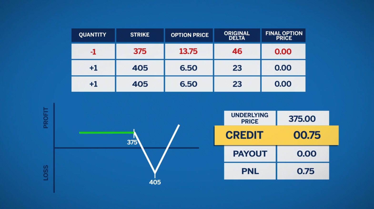 Now let’s look at the 405 strike, these options both will have a long call payoff. The first 405 call that the traders bought will cap the loss on the 375 call that they sold.