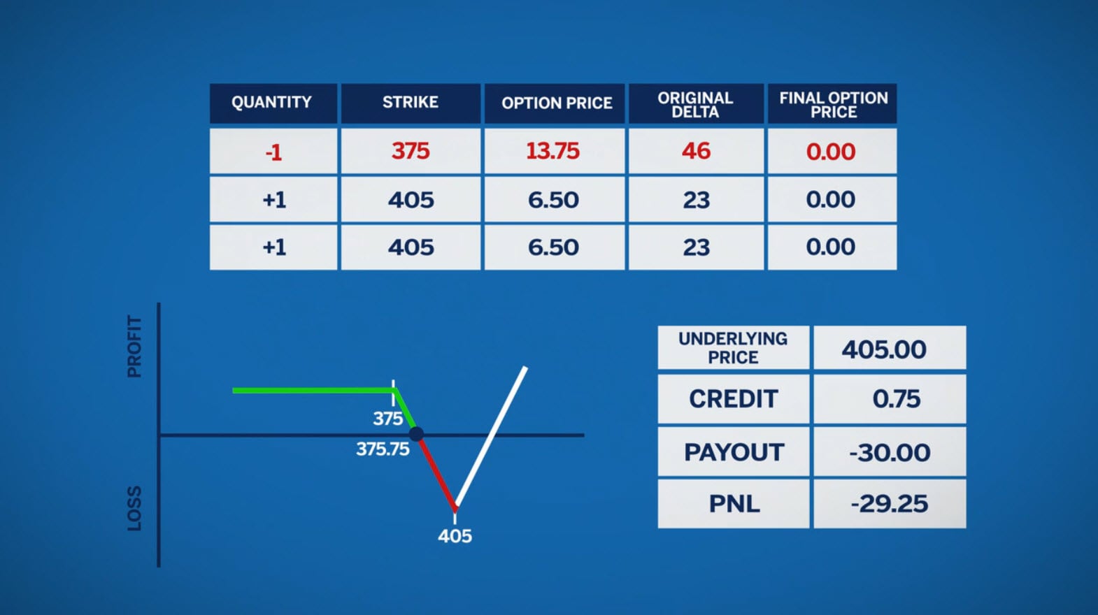 The 375 strike has a 46 delta. The 405 strike has a 23 delta. The 405 option will need to be far enough in the money to overcome the loss from the 375 option. Therefore, the market will need to have a considerable upward move.