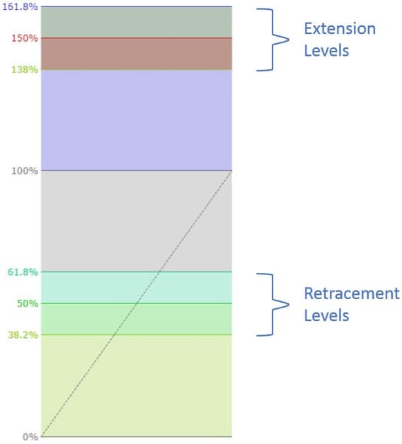 The ratios form the basis to determine the size of the retracement. 38.2% is considered shallow retracement, while a retracement to the 62.8% is considered deeper. A 50% retracement is considered medium.