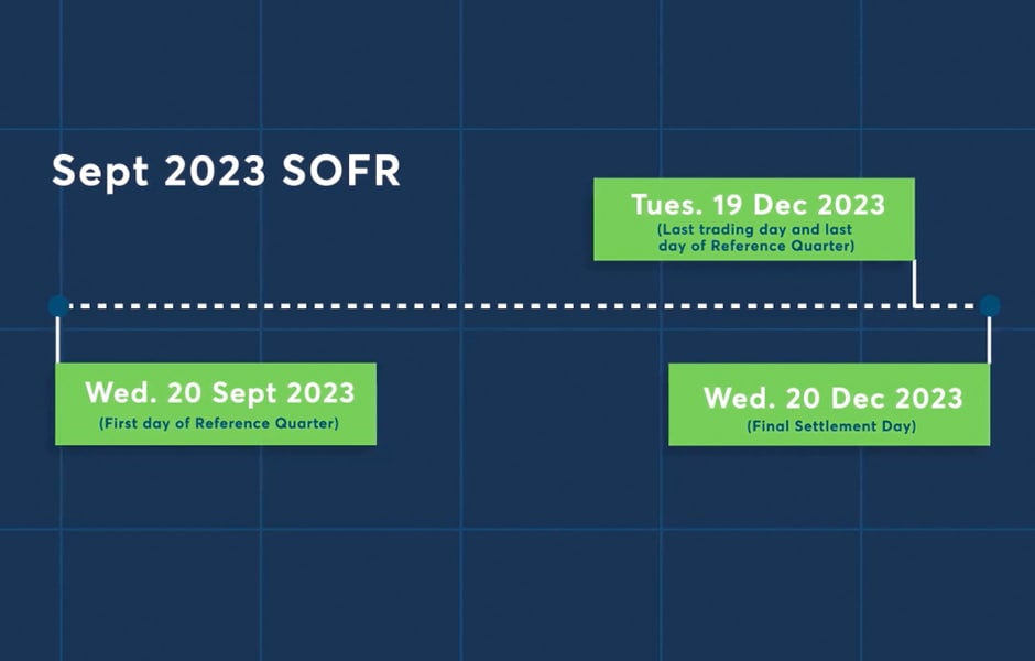 For example, Three-Month SOFR contracts stop trading the business day preceding the third Wednesday three months after the named contract month. In this example, a September contract will trade up until December: