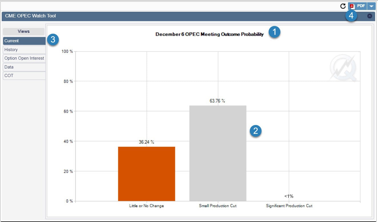 1. When first launched, the CME OPEC Watch Tool will display a bar chart of the calculated probabilities from current market data for the upcoming OPEC meeting.