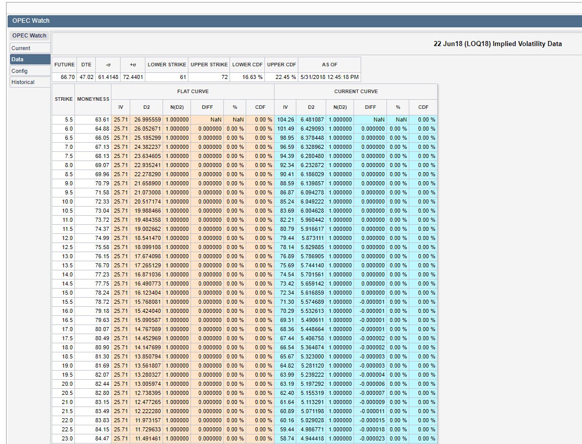 The tab labeled Data on the left side of the tool shows these probabilities are based on implied volatilities in the WTI Crude Oil option market price data calculated from the closest WTI option expiration month that expires after the OPEC meeting.
