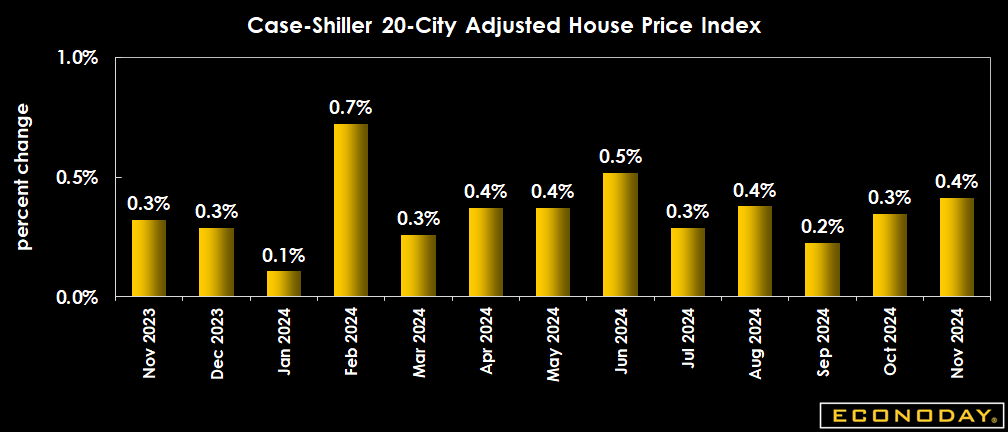 Case-Shiller has depicted a steady slowing in the rate of annual home price inflation with the 20-city composite index up 4.2 percent in October, down from 4.6 percent in September, 5.2 percent in August and 5.9 percent in July. Forecasters look for more slowing to 4.1 percent in November. The consensus looks for the same 0.3 percent increase on the month after a 0.3 percent rise in October.