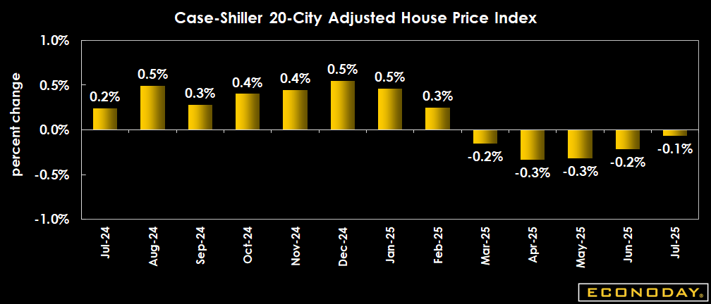 The 20-city adjusted index is down 0.1 percent on the month in July from June, seasonally adjusted. The unadjusted month on month figure declines 0.3 percent.