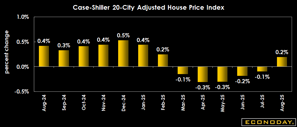 The Case-Shiller 20-city adjusted index is up 0.2 percent on the month in August from July, seasonally adjusted. The unadjusted month on month figure declines 0.6 percent.