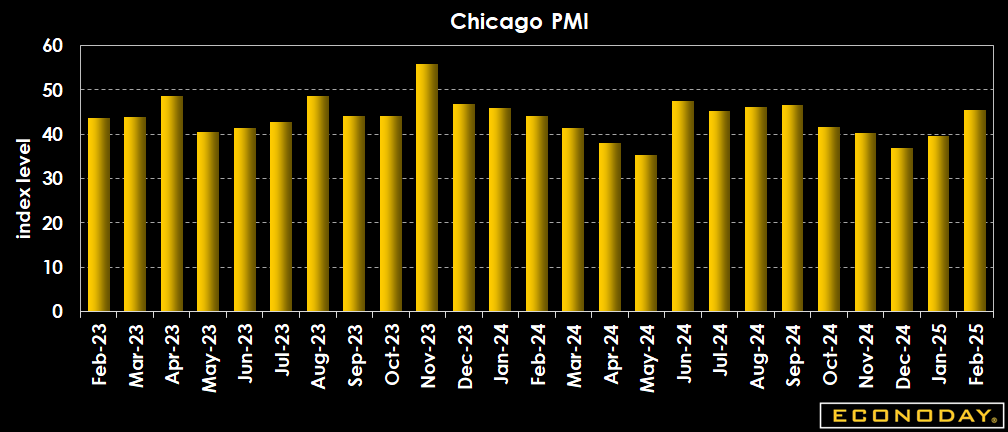 The Chicago PMI perks up more than expected to 45.5 in February from 39.5 in January, well above the expected 41.0 reading. The rise takes it to its highest level since June 2024 but the sub-50 diffusion index represented a 15th straight sequential month/month decline in business activity. That indicates activity continues to contract and has reached very low levels.