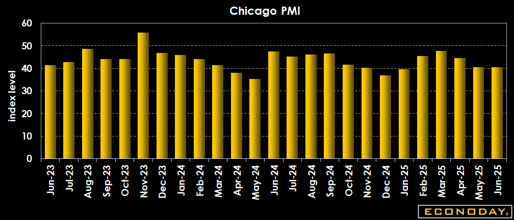 The Chicago PMI disappoints again to the downside at 40.4 in June, down from an already anemic 40.5 in May, and well below the 43.0 anticipated by the Econoday consensus.