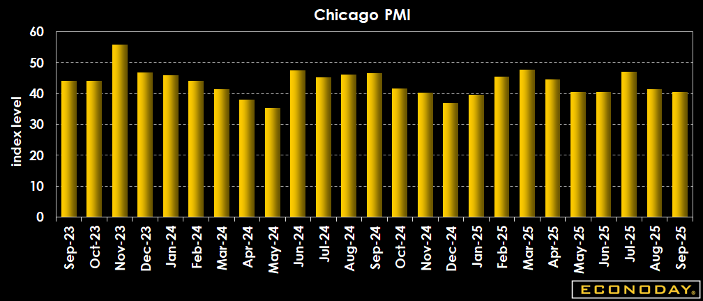 Another weaker than expected reading in an indicator that tends to disappoint: the Chicago PMI falls to 40.6 in September from an anemic 41.5 in August. The Econoday consensus looked for an uptick to 43.5 in September, which only would have suggested a slower rate of decline from August.