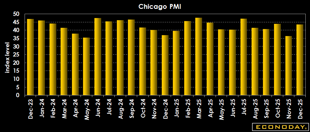The Chicago PMI tops expectations as it ticks up to 43.5 in December from a lower than expected 36.3 in November. The slowing in the rate of contraction reflected less weakness in new orders, production and order backlogs, offset in part by more negative readings in supplier deliveries and employment.