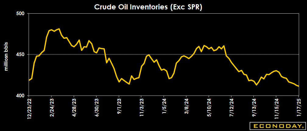 Crude oil inventories decreased by 1.0 million barrels to 411.7 million barrels in the week ended Jan. 17 from 412.7 million a week earlier. The latest total is about 6 percent below the 5-year average for this time of year, and down 2.1 percent from a year ago.