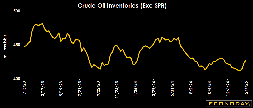 Crude oil inventories are up by 4.1 million barrels to 427.9 million barrels in the week ended Feb. 7 from 423.8 million a week earlier. The latest total is about 4 percent below the 5-year average for this time of year, and down 2.6 percent from a year ago.