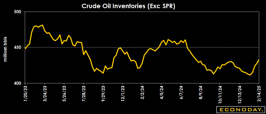 Crude oil inventories rose by 4.6 million barrels to 432.5 million barrels in the week ended Feb. 14 from 427.9 million in the previous week. The latest total is 3 percent below the 5-year average for this time of year, and down 2.4 percent from a year ago.