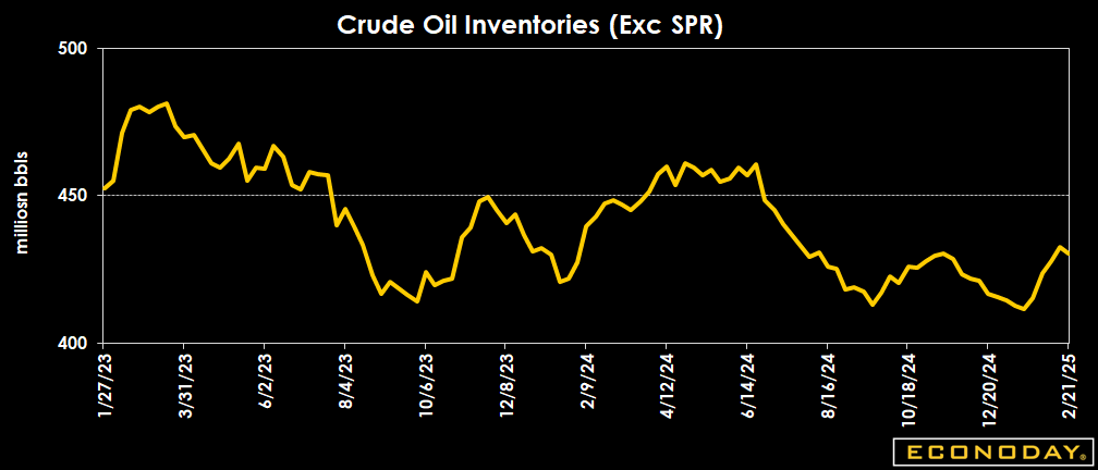 Crude oil inventories are down by 2.3 million barrels to 430.2 million barrels in the week ended Feb. 21 from 432.5 million a week earlier. The latest total is about 4 percent below the 5-year average for this time of year, and down 3.8 percent from a year ago.