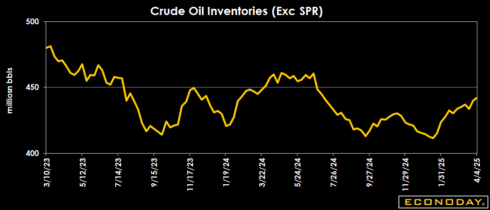 Crude oil inventories are up by 2.6 million barrels to 442.3 million barrels in the week ended April 4 from 439.8 million a week earlier. The latest total is about 5 percent below the 5-year average for this time of year, and down 3.3 percent from a year ago.