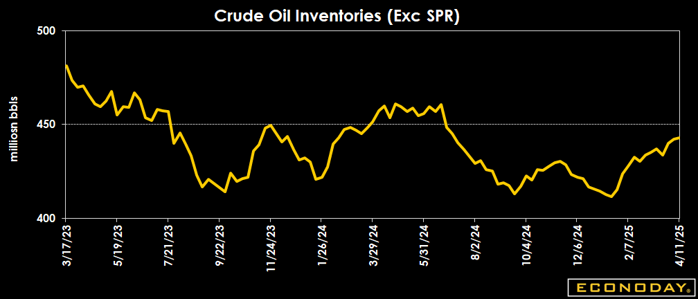 Crude oil inventories are up by 0.5 million barrels to 442.9 million barrels in the week ended April 11 from 442.3 million a week earlier. The latest total is about 6 percent below the 5-year average for this time of year, and down 3.7 percent from a year ago.
