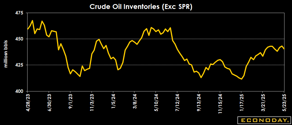 Crude oil inventories fall by 2.8 million barrels to 440.4 million barrels in the week ended May 23 from 443.2 million in the previous week. The latest total is 6 percent below the 5-year average for this time of year, and down 3.2 percent from a year ago.