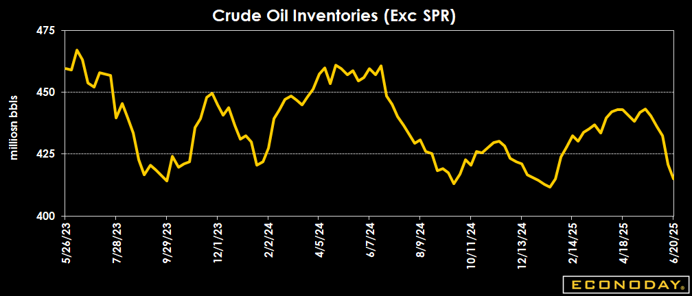 Crude oil inventories are down by 5.8 million barrels to 415.1 million barrels in the week ended June 20 from 420.9 million a week earlier. The latest total is about 11 percent below the 5-year average for this time of year, and down 9.9 percent from a year ago.