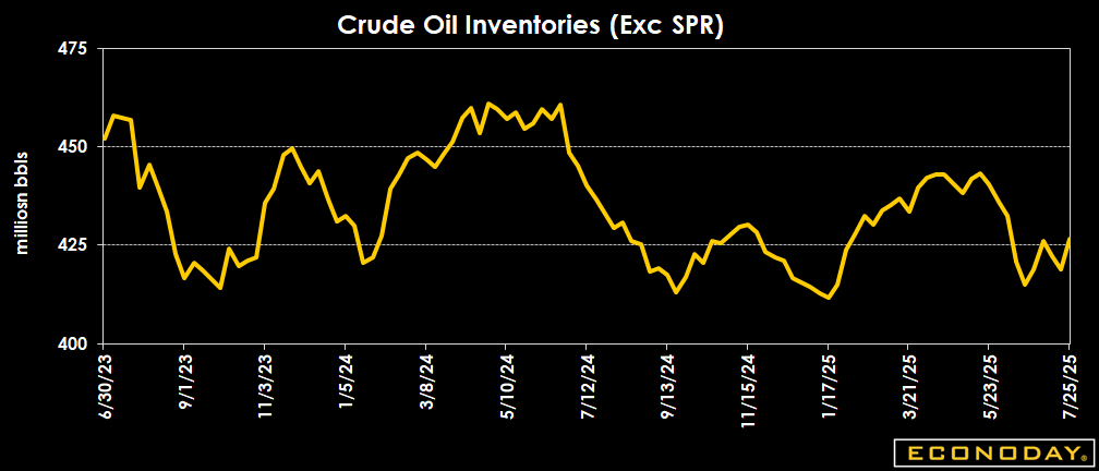 Crude oil inventories are up by an unusually big 7.7 million barrels to 426.7 million barrels in the week ended July 25 from 419.0 million a week earlier. The latest total is about 6 percent below the 5-year average for this time of year, and down 1.5 percent from a year ago.