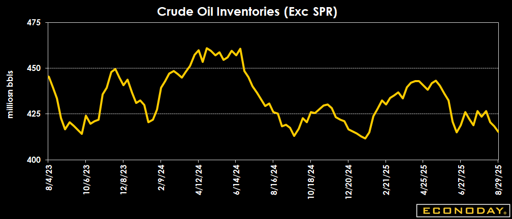 Crude oil inventories are down by an unusually large 9.3 million barrels to 415.4 million barrels in the week ended Sept. 12 from 424.6 million a week earlier. The latest total is about 5 percent below the 5-year average for this time of year, and down 0.5 percent from a year ago.