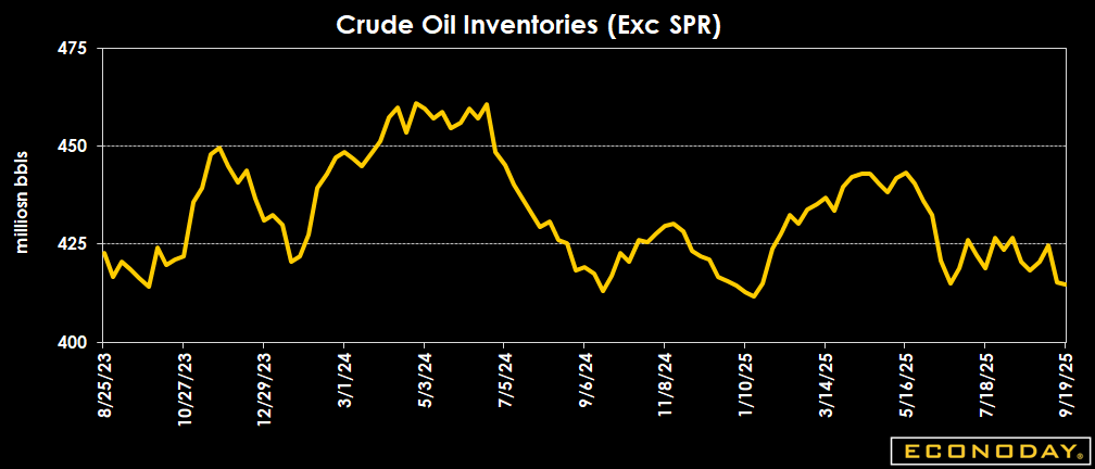 Crude oil inventories are down by 0.6 million barrels to 414.8 million barrels in the week ended Sept. 19 from 415.4 million a week earlier. The latest total is about 4 percent below the 5-year average for this time of year, and up 0.4 percent from a year ago.