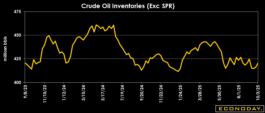 Crude oil inventories are up by 3.7 million barrels to 420.3 million barrels in the week ended Oct. 3 from 416.5 million a week earlier. The latest total is about 4 percent below the 5-year average for this time of year, and down 0.6 percent from a year ago.