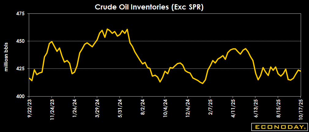 Crude oil inventories are down by 1.0 million barrels to 422.8 million barrels in the week ended Oct. 17 from 423.8 million a week earlier. The latest total is about 4 percent below the 5-year average for this time of year, and down 0.8 percent from a year ago.