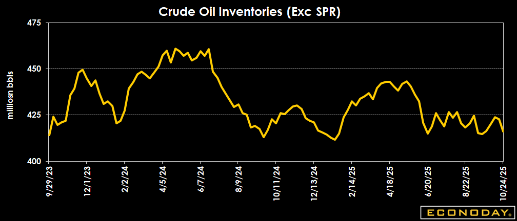 Crude oil inventories are down by a whopping 6.9 million barrels to 416.0 million barrels in the week ended Oct. 24 from 422.8 million a week earlier. The latest total is about 6 percent below the 5-year average for this time of year, and down 2.2 percent from a year ago.