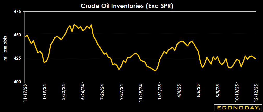 Crude oil inventories are down by 1.3 million barrels to 424.4 million barrels in the week ended Dec. 12 from 425.7 million a week earlier. The latest total is about 4 percent below the 5-year average for this time of year, and up 0.8 percent from a year ago.