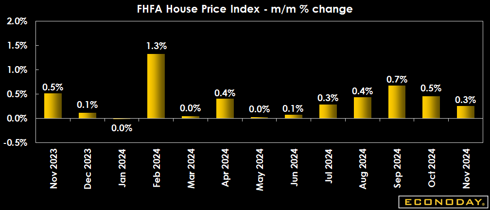 The seasonally adjusted FHFA house price index is up 0.3 percent month-over-month in November after a small upward revision to up 0.5 percent in October. The index is up 4.2 percent compared to November 2023.