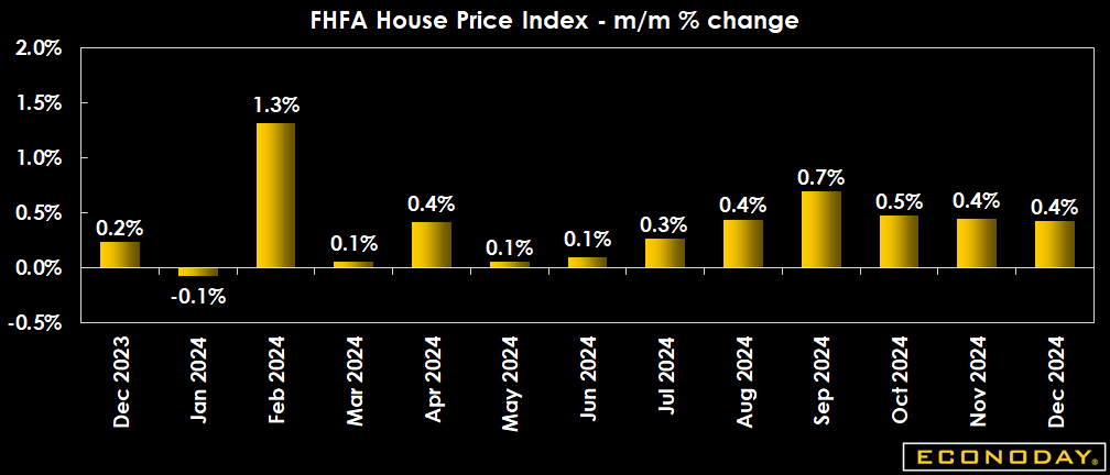 The adjusted FHFA house price index is up 0.4 percent in December from November after a small upward revision to up 0.4 percent in the prior month. The year-over-year increase is up 4.7 percent in December, picking up the annual pace to its fastest in five months for sales of existing single-family homes and refinancing of current mortgages. A small wave of refinancing at a time when home values had escalated may be part of the reason for the increase at a time of year when prices usually moderate.