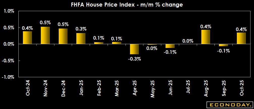 The seasonally adjusted FHFA house price index for October is up 0.4 percent after a small downward revision to down 0.1 percent in September. The year-over-year increase is 1.7 percent, the slowest gain since up 1.7 percent in March 2012. Prices of existing homes and home valuations for refinancing in part reflect the demand or lack of demand as mortgage rates fluctuate. However, the underlying trend for home price increases is moderating and improving affordability for new purchases.