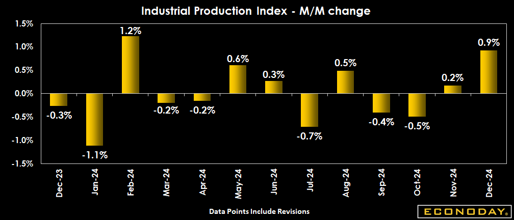 Industrial production is up 0.9 percent in December from November and revised higher to up 0.2 percent in November from October. The increase for December is above the consensus of up 0.3 percent in the Econoday survey of forecasters. In December, manufacturing got a boost at the strike at Boeing was settled. Mining rebounded in December in part on higher demand and higher prices. Utilities output increased in response to colder across the US.