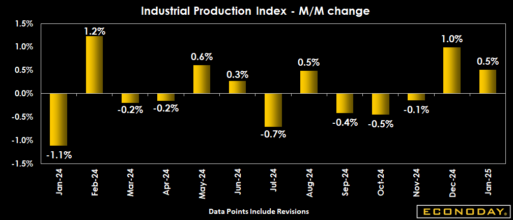Industrial production came in stronger than expected with output up 0.5 percent on the month in January after a revised 1.0 percent rise in December (versus an increase of 0.9 percent previously reported for December). The consensus looked for a more modest 0.3 percent increase for January.