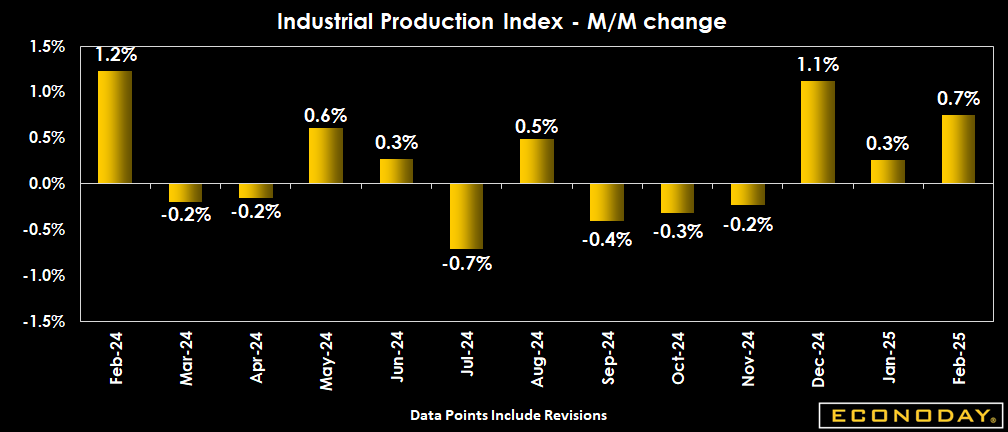 A much more robust picture of the industrial sector than expected: Industrial production came in much stronger than the consensus forecast with output up 0.7 percent on the month in February after a revised 0.3 percent rise in January (versus an increase of 0.5 percent previously reported for January). The consensus looked for a modest 0.2 percent increase for February.
