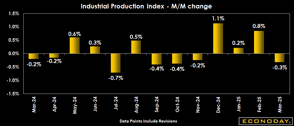 The consensus sees industrial output down 0.2 percent and manufacturing up a modest 0.2 percent on the month with capacity utilization down at 78.0 percent versus 78.2 percent in February. February saw strong increases of 0.7 percent in industrial production overall and 0.9 percent for manufacturing, with a boost from motor vehicles and increases in most other durable goods categories. Trade worries appear to have stalled momentum in the sector after three straight monthly increases.