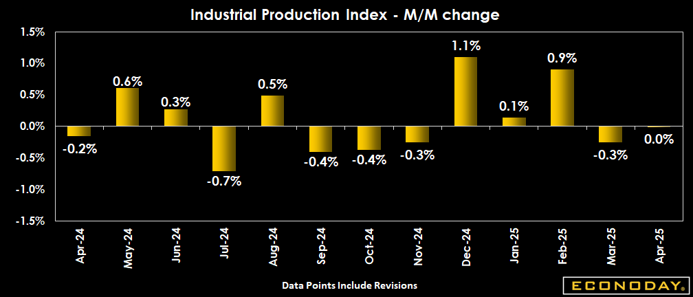 Output comes in flat for April from March, just below the expected 0.2 percent rise, as a big 3.3 percent rise in utilities offsets declines in manufacturing and mining. Manufacturing output is depressed by lower output of motor vehicles and parts, down 1.9 percent on the month.