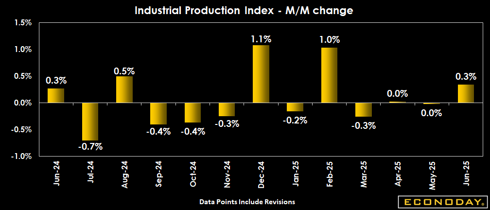 Industrial production comes in up 0.3 percent for June, beating the expected 0.1 percent rise in the Econoday survey of forecasters. A 2.8 percent jump in utilities, plus an uptick in manufacturing activity, drives the increase. May industrial production was revised to no change from the -0.2 percent initially reported.