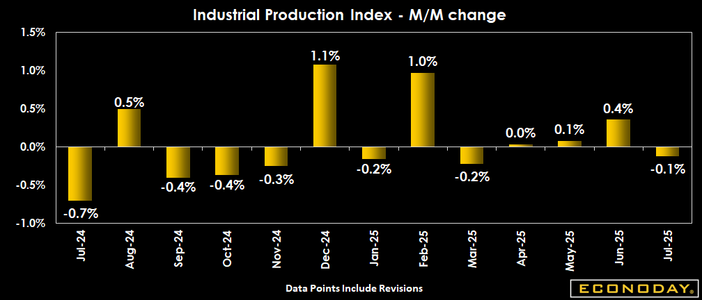 Industrial production comes in down 0.1 percent for July after a 0.4 percent increase in June (revised from +0.3 percent), beating expectations for no change in the Econoday survey of forecasters. A decline in utilities output, plus a contraction in mining activity, fueled the contraction.
