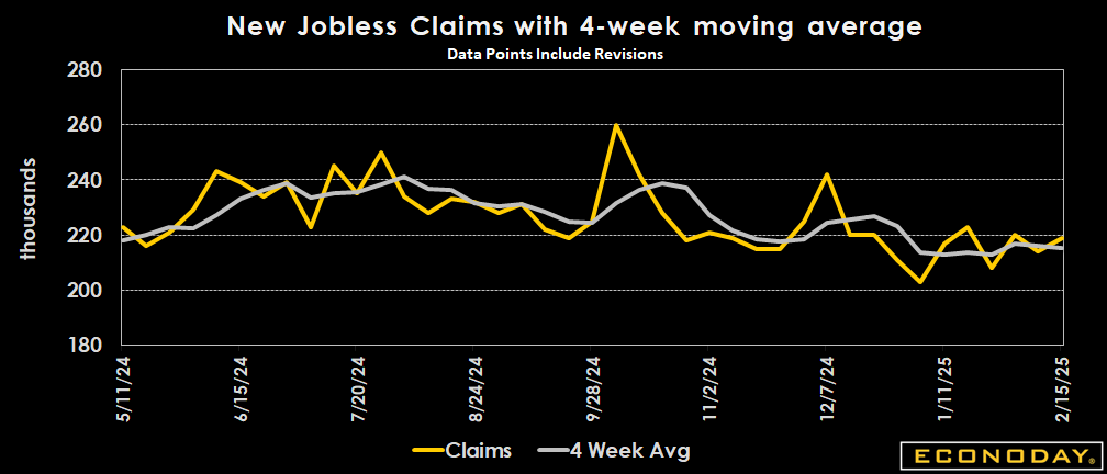 Initial jobless claims came in higher than expected in the latest week, rising by 5,000 in the week ending February 15 from the revised 214,000 level (previously 213,000) reported for the prior week. The February 15 week's level compares to the consensus of 215,000 in the Econoday survey of forecasters. The four-week moving average is down 1,000 to 215,250 in the February 15 week, after 216,250 in the prior week.