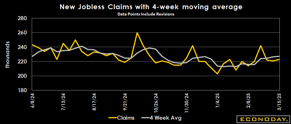 Initial jobless claims came in less than expected in the latest week, rising by 2,000 in the week ending March 15 from the revised 221,000 level (previously 220,000) reported for the prior week. The March 15 week's level compares to the consensus of 225,000 in the Econoday survey of forecasters. The four-week moving average is up by 750 to 227,000 in the March 15 week, after 226,250 in the prior week.