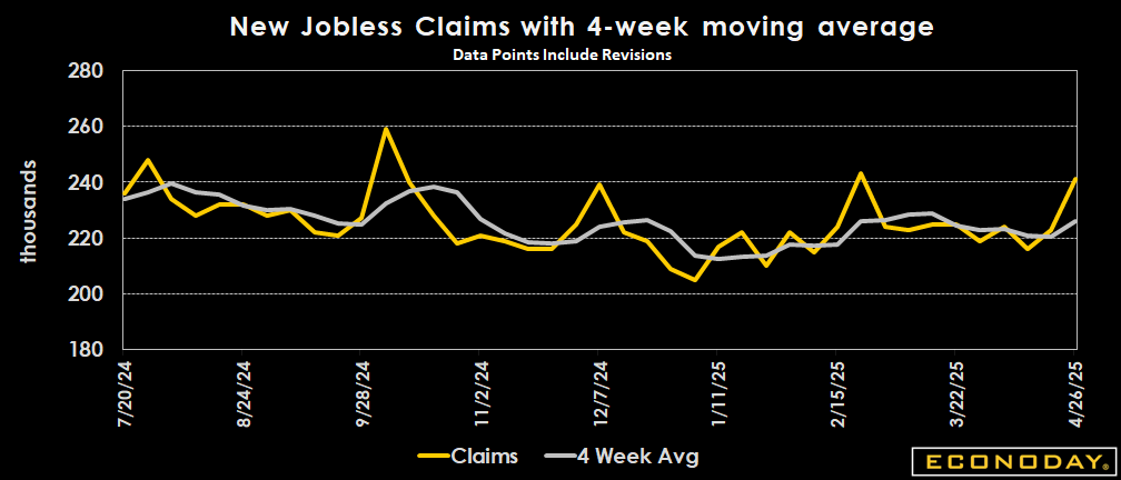 Initial claims numbers were on an upward trend through most of April, while the persistently high level of continuing claims (yet to drop below 1.8 million since May 2024) underscores the growing downside risks to the Federal Reserve's employment mandate.