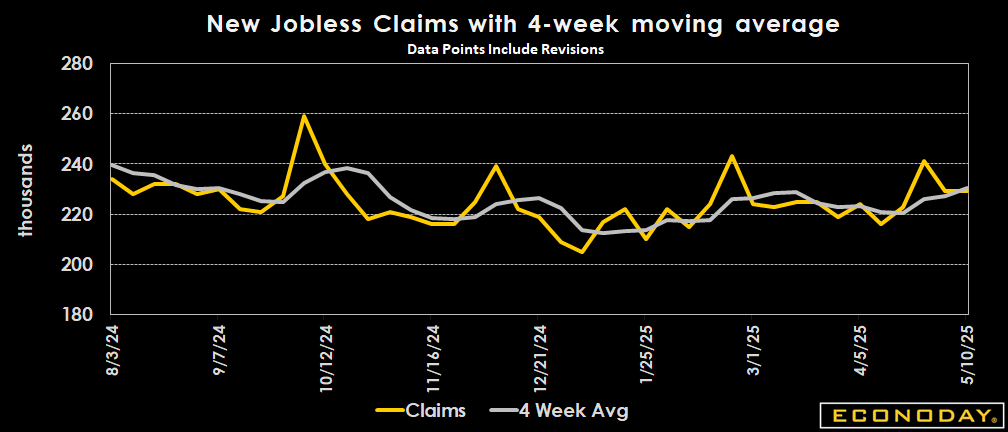 Initial jobless claims came in as expected, with the level reported in the week ending May 10 the same as the revised 229,000 level (previously 228,000) reported for the prior week. The May 10 week's level matches the consensus of 229,000 in the Econoday survey of forecasters. The four-week moving average is up by 3,250 to 230,500 in the May 10 week.